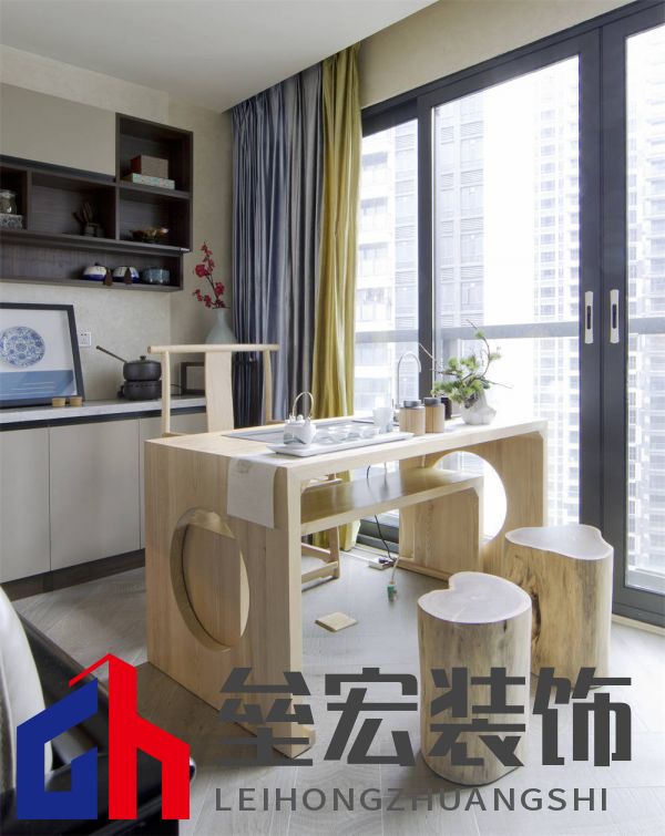 本案例三口之家,業(yè)主女兒國外留學(xué),基本上業(yè)主夫妻兩人居住,案例利用了現(xiàn)代的表現(xiàn)手法來打造東方美學(xué)的韻律,將中式元素與現(xiàn)代時尚巧妙糅合,正是目前社會都市精英圈層所追求的雅致生活,中式素雅、氣質(zhì)之美。 一切以功能出發(fā),注重空間收納和人文情懷。為了滿足男女主人各自喝茶和品酒的愛好,設(shè)計師重新規(guī)劃了陽臺的布局,利用落地推拉窗的形式把原有的兩個陽臺納入了客餐廳的空間,增加了茶室和品酒區(qū),不但滿足了功能和室內(nèi)的采光,而且又把室外的景觀引入室內(nèi),表現(xiàn)出人與自然的和諧之美,美不勝收。餐廳酒柜時尚簡約,以中式的韻去融合客廳的味。背景墻的山水硬包更是使整個客廳靈動有神,東方之美。