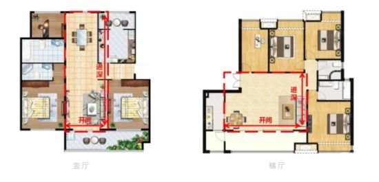▲奧華部分家裝案例 它到底有何魅力?遇上這種戶型又該如何裝修?今天咱就來聊聊橫廳~ 什么是橫廳 認(rèn)識(shí)橫廳之前,我們先來了解兩個(gè)名詞:開間和進(jìn)深。 開間:指相鄰兩個(gè)橫向定軸線間的距離。 進(jìn)深:指建筑物縱深各間的長(zhǎng)度。 我們以往接觸的常規(guī)戶型通常都是豎廳,開間<進(jìn)深,采光來源于客餐廳的兩端,空間狹長(zhǎng)。 當(dāng)開間>進(jìn)深,客廳與餐廳并排同面采光,空間寬敞通透,即我們說的橫廳。