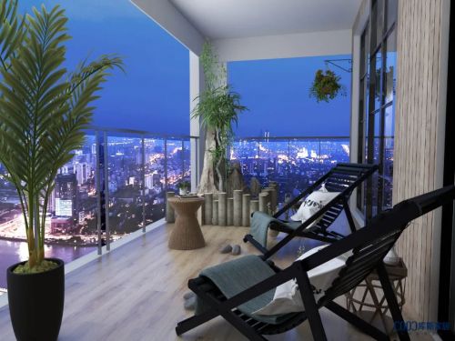 熱帶植物與舒適躺椅在透明欄桿前“依偎”——太陽在浩瀚的天際線升落,撒下一片暗夜藍(lán),唯美壯麗的景觀就是這里的生活日常。