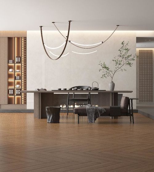 應用產(chǎn)品:云紗深灰、海南黃花梨-黃金棕 茶室運用人字形拼木紋瓷磚,利用深色地板打造自然深邃的空間。幾何圖案為空間增加了線條感,簡單又大氣,綠樹盆栽的點綴,更是增添了空間的活力。