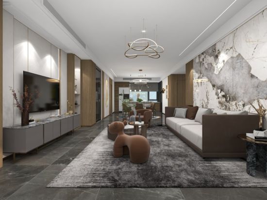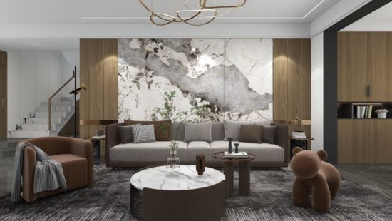沙發(fā)背景墻運(yùn)用奧華石晶壁畫、黃栗柚搭配。在看似自然樸素的外表下隱藏著貴族的氣質(zhì)。