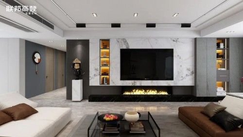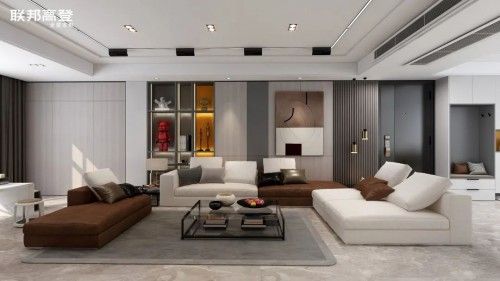 與墻同寬的挑高餐邊收納柜,配色紋理堅(jiān)守著冷峻理性,讓紳士格調(diào)盡顯;同時(shí)利用回字型設(shè)計(jì)將存儲值拉滿,為日常收納輕松減壓。 二、客廳全屋定制設(shè)計(jì) 客廳作為居家休閑、待客的重要區(qū)域,占地面積大且注意事項(xiàng)更多。合適的客廳空間設(shè)計(jì),既能提升居家幸福感,也能彰顯出屋主的個(gè)性品味。