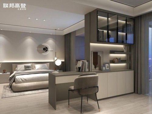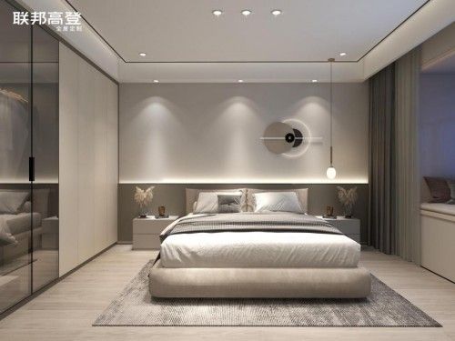 簡約別致又展露心思,拼色護(hù)墻相搭、比例虛實(shí)結(jié)合;通透大方搭配,將現(xiàn)代家的質(zhì)感得以全面體現(xiàn)。 三、臥室全屋定制設(shè)計(jì) 作為全屋設(shè)計(jì)中的私密專屬空間,臥室的設(shè)計(jì)尤其講究自然舒適性,打造出一個(gè)靜謐放松之地。與此同時(shí),如果能在功能空間上安排更為巧妙,滿足豐富生活需求,那就更加完美了。