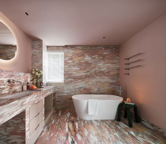 設計回歸需求 空間不被限制 “我喜歡在衛(wèi)生間喝咖啡。”柯沅伽語出驚人,但是當你看到她的衛(wèi)浴間時便能完全理解。,這個以小眾大理石挪威紅和防水乳膠漆搭配打造的粉色獨立衛(wèi)浴空間,獨特而不張揚、清爽又夢幻。衛(wèi)生間秉持三分離功能特點,不僅貌美,還兼具實用性。超寬的洗漱臺面可以安置她喜愛的各式香薰蠟燭與日常洗護用品。在獨享洗浴時能喝上一杯紅酒,泡澡時的閱讀都讓放松感油然而生。