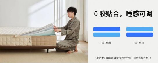 不僅如此,棲作在產(chǎn)品設(shè)計(jì)源頭,也堅(jiān)持將循環(huán)理念融入其中,持續(xù)關(guān)注原材料創(chuàng)新及環(huán)保材料的應(yīng)用?!复髱煛勾矇|正是這一理念的必然產(chǎn)物。 可持續(xù)滿足睡眠需求 「大師」床墊延續(xù)棲作一貫的特點(diǎn),做了全床可拆卸、墊層可調(diào)節(jié)設(shè)計(jì),可以滿足睡眠者不斷變化的睡眠需求。不論是長時(shí)間加班后所需的護(hù)脊睡感,還是休閑玩樂后必要的釋壓睡感,都能在同一張床墊上實(shí)現(xiàn),具備極強(qiáng)的靈活性。即便后期睡眠需求發(fā)生變化,僅通過換墊層就能低成本匹配全新睡感,這種睡眠體驗(yàn)被棲作定義為“陪伴型睡眠”。