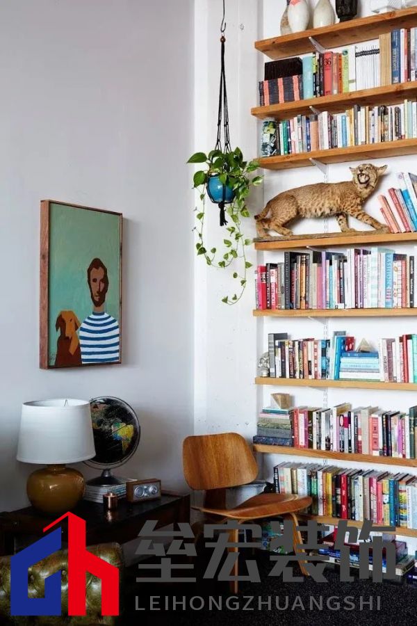 ? 02、 藝術(shù)型書空間Caroline是名雜志社編輯,她家是個(gè)改造后的閣樓。整個(gè)空間如她一樣有趣、酷炫。她熱衷于改造,就好像在一張空白畫布上創(chuàng)作?!皩?duì)我來說,一個(gè)空間永遠(yuǎn)不會(huì)完工,因?yàn)樗蔷幼≌呱畹恼鎸?shí)反映?!遍喿x角是家里的愜意所在,白日里她常以多種姿勢(shì)癱在這兒,翻動(dòng)喜歡的書籍。擱板架延續(xù)至整墻,與木質(zhì)單椅保持統(tǒng)一材質(zhì)、色系,整潔干凈且富有延續(xù)性。曾喜歡用色彩整理書籍的她,現(xiàn)在更愿意給予空間一種自在隨性的氛圍感,于是當(dāng)下的收納更偏主題性。旁邊一幅Hidir?Jiang?Tapanoglu的總統(tǒng)肖像,為這個(gè)松弛角落增添一抹別樣藝術(shù)氣息。