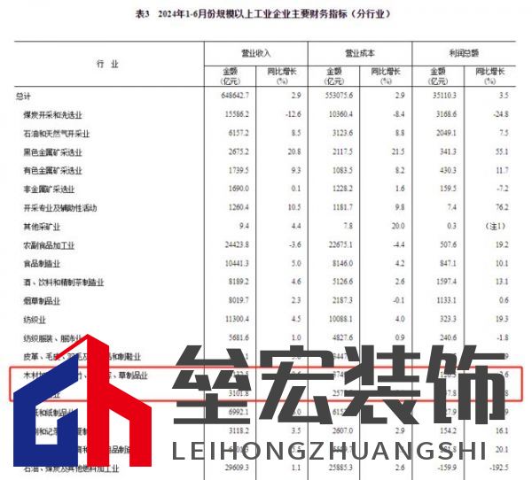 | 7月27日,國(guó)家統(tǒng)計(jì)局發(fā)布2024年上半年全國(guó)規(guī)模以上工業(yè)企業(yè)運(yùn)行情況。 數(shù)據(jù)顯示,1—6月份,全國(guó)規(guī)模以上工業(yè)企業(yè)實(shí)現(xiàn)利潤(rùn)總額35110.3億元,同比增長(zhǎng)3.5%;營(yíng)業(yè)收入64.86萬(wàn)億元,同比增長(zhǎng)2.9%;營(yíng)業(yè)收入利潤(rùn)率為5.41%,同比提高0.03個(gè)百分點(diǎn)。 分行業(yè)看,泛家居行業(yè)方面,1—6月份,全國(guó)家具制造業(yè)規(guī)模以上工業(yè)企業(yè)實(shí)現(xiàn)營(yíng)業(yè)收入3101.8億元,同比增長(zhǎng)5%;實(shí)現(xiàn)利潤(rùn)總額137.8億元,同比增長(zhǎng)3.8%。 1—6月份,全國(guó)木材加工和木、竹、藤、棕、草制品業(yè)規(guī)模以上工業(yè)企業(yè)實(shí)現(xiàn)營(yíng)業(yè)收入4132.5億元,同比下降0.6%;實(shí)現(xiàn)利潤(rùn)總額126.3億元,同比增長(zhǎng)2.6%。
