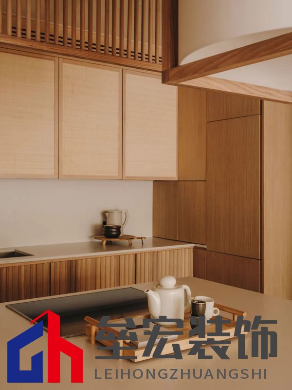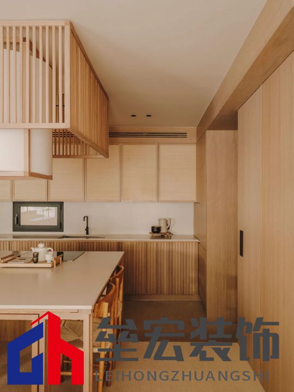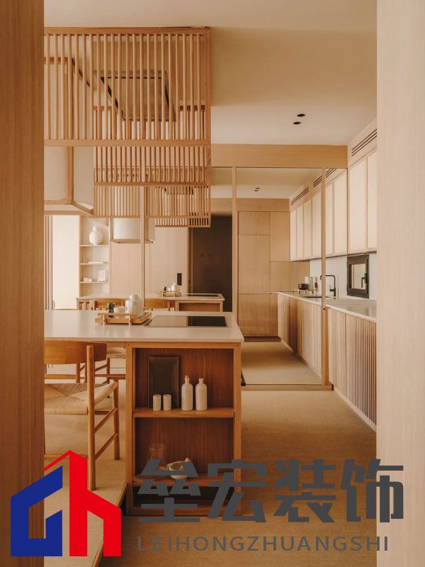 開放式廚房設(shè)計(jì)簡潔而高效,強(qiáng)調(diào)實(shí)用性與美觀的結(jié)合。自然木材料的使用增強(qiáng)了溫馨感,提供一個(gè)舒適的烹飪環(huán)境。
