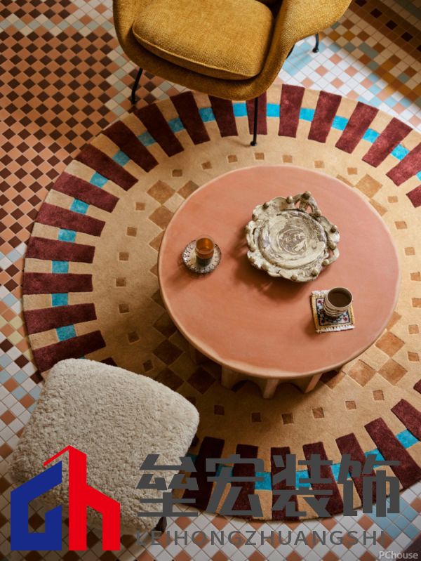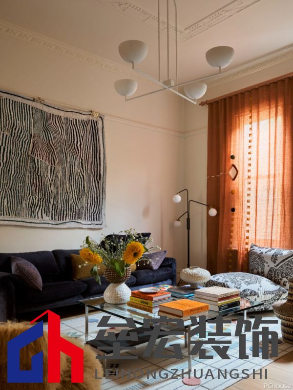 夏季客廳為了增強對比,設(shè)計師選擇了姜黃色的窗簾,并在地毯上引入了抽象幾何圖案,與整個住宅的設(shè)計語言一致。