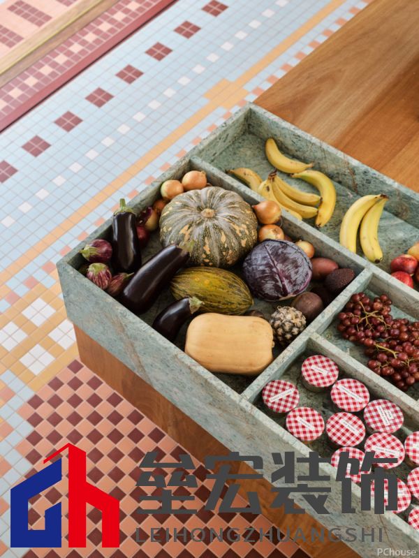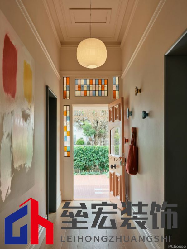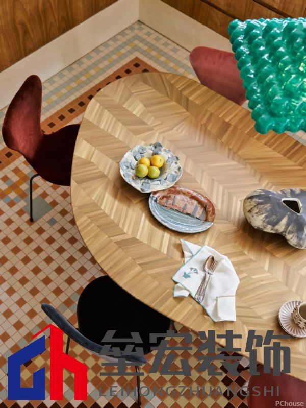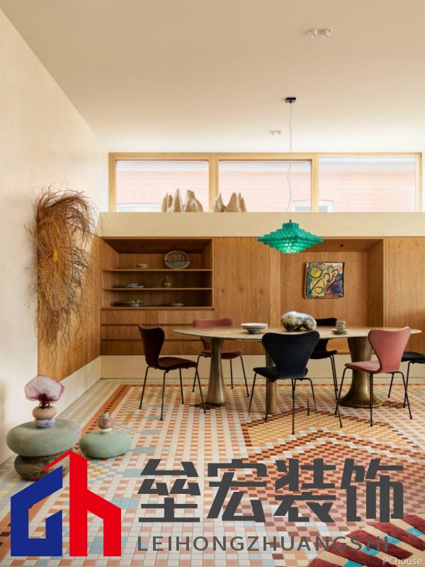 玄關(guān)是進入住宅的第一印象,也是這所房子風(fēng)格的初步展示。入口處寶石色的鉛燈玻璃成為設(shè)計中的亮點,賦予空間一種濃郁的異國情調(diào),并且將視覺線條引向后方擴建部分。瓷磚圖案借鑒了波斯地毯的設(shè)計,形成了一塊具有像素化效果的“地毯”,通過材料和圖案的創(chuàng)新將新舊空間連接起來,同時預(yù)示著房屋內(nèi)其他區(qū)域豐富的幾何細節(jié)。