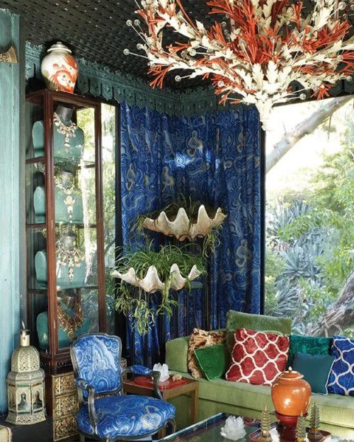 Wendy?Morrison的極繁主義之家,充滿幻想的東方元素。同時她還會在設計中考慮到風水方面知識,用以平衡空間的自然元素。 ? 極繁主義始終在物質與精神的拉鋸戰(zhàn)中尋找平衡點。但設計中的繁復之美,絕非沒有章法的物質堆砌,看似元素間撕扯拉鋸,可是暗藏邏輯在其中。 美學歷程螺旋上升,家的美學也一樣,所謂的節(jié)制與放縱永恒辯證,此刻不是永恒,但此刻的感受卻可以永恒存在。 極繁主義被重新“愛上”也許是因為寡淡久了希望換種風格,也或許真的是厭惡了所謂的條框與冰冷的舒服,想要尋找真正的自我。 極繁主義強調“大膽、豐富、層次感”,通過色彩、圖案、材質和裝飾品的疊加,打造充滿個性與視覺張力的空間。 但極繁主義不是毫無頭緒的,無論多豐富的空間里,依舊是能在其中找到視覺核心,其他的存在皆是圍繞而而生的,而在混搭中的調性上的一致,也是保證more?is?more能夠真的實現(xiàn)美的關鍵,你會發(fā)現(xiàn)暗藏在其中的主線,些許的留白,更是那神來之筆。 01° 出挑的色彩 豐富、層次、點睛 說起極繁人們80%都會先想到色彩,或許是高飽和度的,也可能是對比強烈的色彩組合,如寶石藍、祖母綠、深紅、亮黃等,多種撞色也經(jīng)常會出現(xiàn)。 我們還可以看到在墻面、家具、軟裝的色彩疊加,產(chǎn)生豐富的視覺層次感,也有在基礎色調中加入小面積跳色來制造視覺焦點。