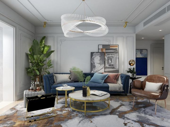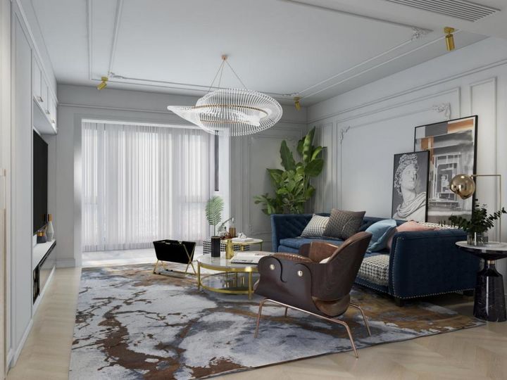 這套案例中設(shè)計師大量融入了法式風格的設(shè)計元素,沙發(fā)背景墻的雕花線條,配上黃銅水晶吊頂燈的映襯,奢華大理石花紋地毯與深色皮質(zhì)沙發(fā)的搭配,共同營造出復古且充滿韻味的空間。