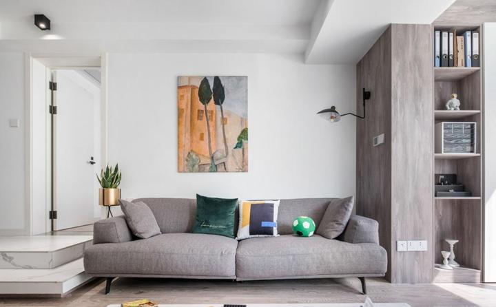 客廳主打簡約的木質(zhì)風,頂天立地的收納柜,放置書籍與藝術(shù)裝飾品。墻面除了一幅靈動的藝術(shù)畫,不再施加粉黛,塑造出一種干凈、清爽的視覺感受。