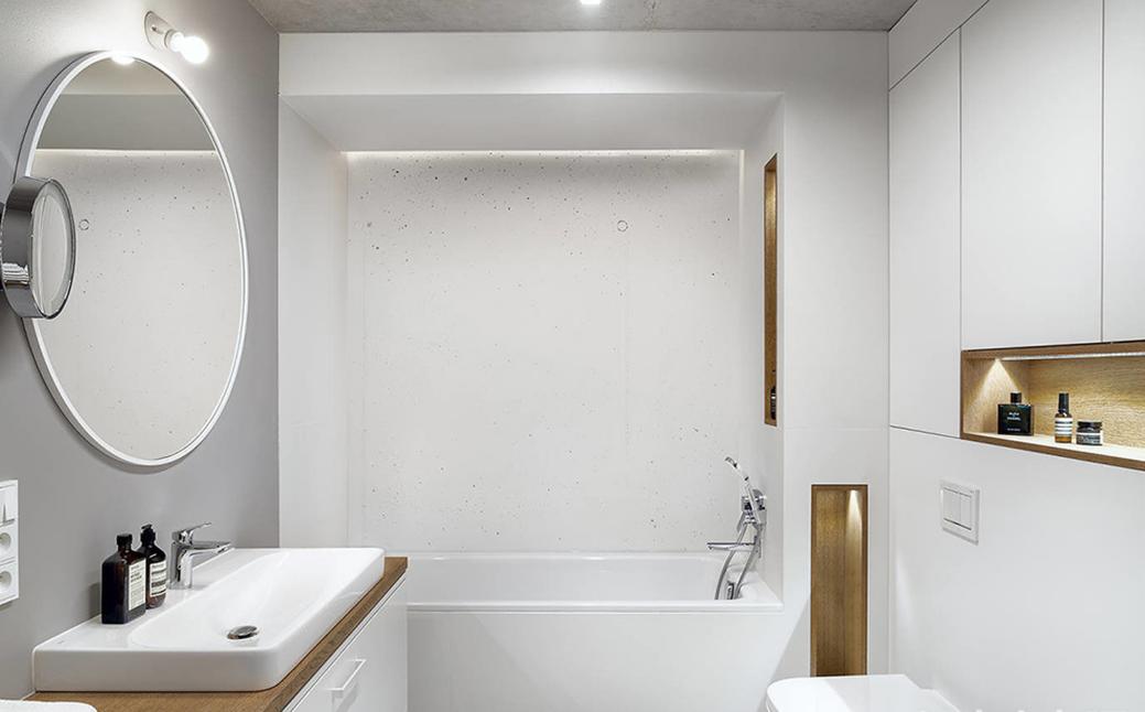 白色和淺灰色的搭配使得整個空間風格分明又相互協(xié)調(diào),給人一種和諧質(zhì)感。白色基調(diào)下,加入金色元素,圓形鏡面相比方形更顯精致,也更為適合整體風格。