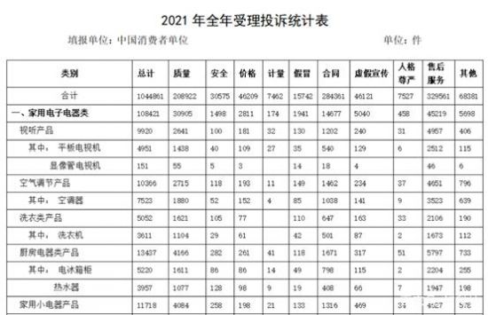 | ??日前,中國消費(fèi)者協(xié)會公布了全國消協(xié)組織受理投訴情況的統(tǒng)計結(jié)果?!夺斂萍肌纷⒁獾?,根據(jù)2021年商品大類投訴數(shù)據(jù),家用電子電器類、日用商品類、食品類、服裝鞋帽類和交通工具類投訴量居前五位。其中,家用電子電器類投訴量達(dá)到10.8萬件,位居投訴榜首位。 ??有媒體注意到,消協(xié)統(tǒng)計的家用電子電器類產(chǎn)品,包括了相機(jī)、手機(jī)、PC,但即便去除這些品類,單純家電類產(chǎn)品的投訴也接近5萬件,規(guī)模十分龐大。 ??一般認(rèn)為,家電產(chǎn)業(yè)經(jīng)過四十多年的發(fā)展,已經(jīng)非常成熟。無論是產(chǎn)品質(zhì)量還是服務(wù)水平,都達(dá)到了一個成熟期。理論上說,用戶投訴量不應(yīng)該居高不下。但實(shí)際情況卻是,家電類產(chǎn)品在歷年消協(xié)投訴榜上的位置都十分靠前,消費(fèi)者的滿意度并不高。 ? 此外,在家用電子電器類產(chǎn)品投訴內(nèi)容中,質(zhì)量投訴和售后服務(wù)投訴最多,分別為3.1萬件和4.5萬件,占比分別為28.7%和41.7%, 超過7成的投訴指向了質(zhì)量和售后服務(wù)。