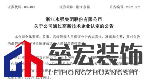 1月26日,浙江永強(qiáng)發(fā)布《關(guān)于公司通過高新技術(shù)企業(yè)認(rèn)定的公告》,稱浙江永強(qiáng)集團(tuán)股份有限公司(以下簡(jiǎn)稱“公司”)根據(jù)全國(guó)高新技術(shù)企業(yè)認(rèn)定管理 工作領(lǐng)導(dǎo)小組辦公室2022年1月24日發(fā)布的《關(guān)于對(duì)浙江省2021年認(rèn)定的第一批高新技 術(shù)企業(yè)進(jìn)行備案的公告》獲悉,公司被認(rèn)定為高新技術(shù)企業(yè)。 1、證書編號(hào)::GR202133005678 2、發(fā)證日期:2021年12月16日 3、有效期:3年 對(duì)公司的影響: 根據(jù)國(guó)家相關(guān)規(guī)定,公司自本次通過高新技術(shù)企業(yè)認(rèn)定后連續(xù)三年(2021年至2023年)可享受國(guó)家關(guān)于高新技術(shù)企業(yè)的稅收優(yōu)惠政策,即按15%的稅率繳納企業(yè)所得稅。公司獲得高新技術(shù)企業(yè)認(rèn)定后,原企業(yè)所得稅稅率從25%調(diào)整為15%,對(duì)公司未來(lái)年度經(jīng)營(yíng)狀況將產(chǎn)生積極影響。 四、江山歐派:全資子公司江山花木匠家居有限公司 1月25日,江山歐派發(fā)布《關(guān)于全資子公司通過高新技術(shù)企業(yè)認(rèn)定的公告》。