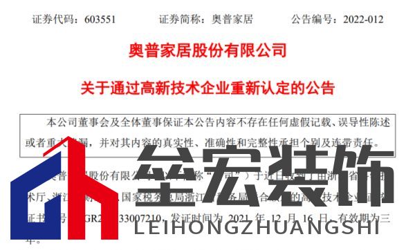 《高新技術(shù)企業(yè)證書》基本情況: 1、證書編號(hào):GR202133002641 2、發(fā)證日期:2021年12月16日 3、有效期:3年 對(duì)公司的影響: 本次高新技術(shù)企業(yè)的認(rèn)定系公司原證書有效期滿后的重新認(rèn)定。根據(jù)《中華人民共和國(guó)企業(yè)所得稅法》及國(guó)家對(duì)高新技術(shù)企業(yè)的相關(guān)稅收規(guī)定,公司自本次通過高新技術(shù)企業(yè)認(rèn)定后連續(xù)三年(即2021年至2023年)繼續(xù)享受高新技術(shù)企業(yè)的相關(guān)稅收優(yōu)惠政策,按照15%的所得稅率繳納企業(yè)所得稅。 二、奧普家居: 1月27日,奧普發(fā)布《關(guān)于通過高新技術(shù)企業(yè)重新認(rèn)定的公告》。