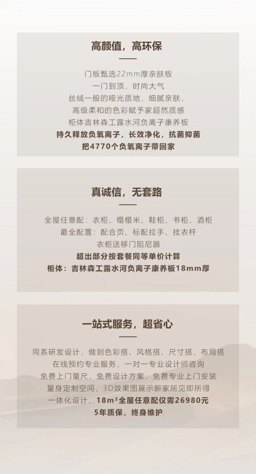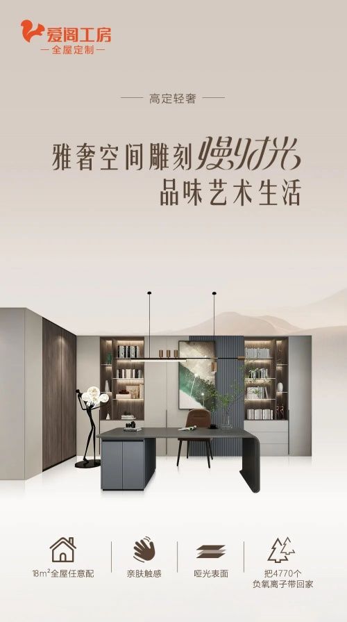 | 愛(ài)閣工房全屋定制成立于2003年,是一家集研發(fā)、設(shè)計(jì)、生產(chǎn)、 銷(xiāo)售、服務(wù)為一體的全屋定制家居企業(yè)。多年來(lái),企業(yè)一直堅(jiān)持綠色環(huán)保路線的探索,嚴(yán)選健康環(huán)保板材,引進(jìn)吉林森工露水河負(fù)離子康養(yǎng)板。該板材具有持久釋放負(fù)氧離子、凈化空氣,抗菌抑菌等健康環(huán)保的特性,為萬(wàn)千家庭營(yíng)造了環(huán)保健康的家居環(huán)境,真正做到即裝即享,負(fù)離子空間。 為回饋愛(ài)閣工房眾多客戶的支持,愛(ài)閣工房推出新品高定輕奢套餐,18m2定制滿足5大空間需求,衣柜、書(shū)柜、鞋柜、榻榻米、酒柜全屋任意配,僅需26980元,把4770個(gè)負(fù)氧離子帶回家,享受慢生活帶來(lái)的愜意。