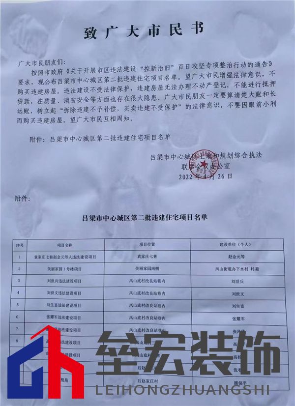 | 2022年4月26日,值山西呂梁違建拆除百日攻堅(jiān)行動(dòng)火熱開展之際,呂梁市中心城區(qū)土地和規(guī)劃綜合執(zhí)法聯(lián)席會(huì)議辦公室再次發(fā)布致廣大市民書,書中就呂梁市中心城區(qū)第二批違建住宅項(xiàng)目名單進(jìn)行了公示,袁家莊七巷趙金元等人違建項(xiàng)目、美麗家園1號(hào)樓項(xiàng)目、劉世兵違法建設(shè)項(xiàng)目等11個(gè)違建項(xiàng)目赫然在列。 繼4月份百日攻堅(jiān)整治行動(dòng)以來,第一批違建項(xiàng)目已在陸續(xù)拆除中,此次,第二批名單的公布再次表明了呂梁市人民政府對(duì)違建拆除的“零容忍“,其可持續(xù)的長效機(jī)制,彰顯了呂梁市對(duì)拆除違建的信心和決心。