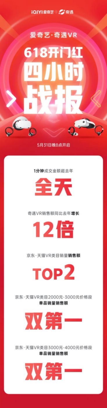 | 5月31日晚8點(diǎn),618電商盛典火爆開啟。作為時(shí)下最in的科技產(chǎn)品,VR一體機(jī)受到廣大消費(fèi)者的瘋搶。以國產(chǎn)VR頭部品牌奇遇VR為例,昨晚618開門紅僅1分鐘,其成交金額就輕松超過去年同期的全天銷量。截止當(dāng)晚24點(diǎn),奇遇VR銷量較去年同比增長12倍!與此同時(shí),還斬獲京東、天貓VR類目銷量及銷售額第二,以及雙平臺(tái)2000-3000元及3000-4000元價(jià)格段的單品銷量&銷售額的雙料冠軍。