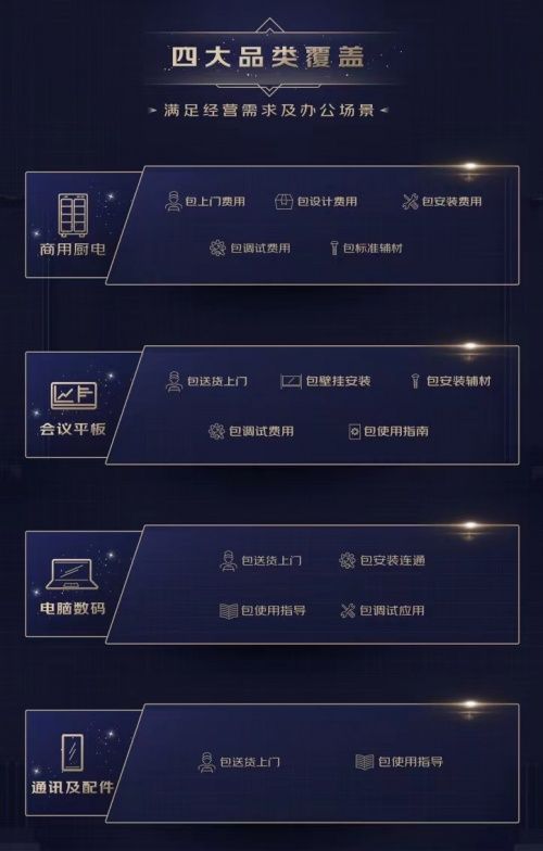 升級后的方案在原有商用廚電、會議平板兩大品類的基礎上,新增電腦數(shù)碼、通訊及配件品類,精準滿足企業(yè)經營以及辦公場景需要;讓企業(yè)在采購商用3C家電產品時,無需二次支付費用,即可享有“包勘測”、“包安裝”、“包設計”、“包輔材”在內的一整套工程采購服務權益,并且每一步都嚴格依照企業(yè)采購需求,由專業(yè)人員全程把關,工程交付體驗省心、省時、省力、高效便捷。