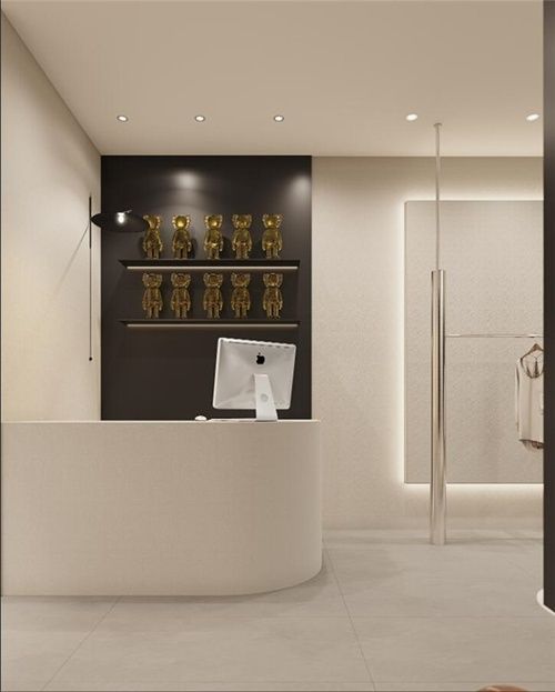 重置室內(nèi)設計,窺見浪漫色彩,利用藝術(shù)涂料打造自然風格,溫柔低調(diào)的米色,透露出隱隱高 級質(zhì)感,喚醒沉睡的藝術(shù)感官,讓顧客享受著購物所帶來的愉悅感的同時,開啟一場服裝與藝術(shù)的對話。 收銀臺同樣落落大方,圓弧線條,給空間增添一抹柔和美感,金屬元素的運用更顯精致,在現(xiàn)代主義的濾鏡下,極簡以新形態(tài)呈現(xiàn),有限的空間營造出舒適休閑的氛圍。