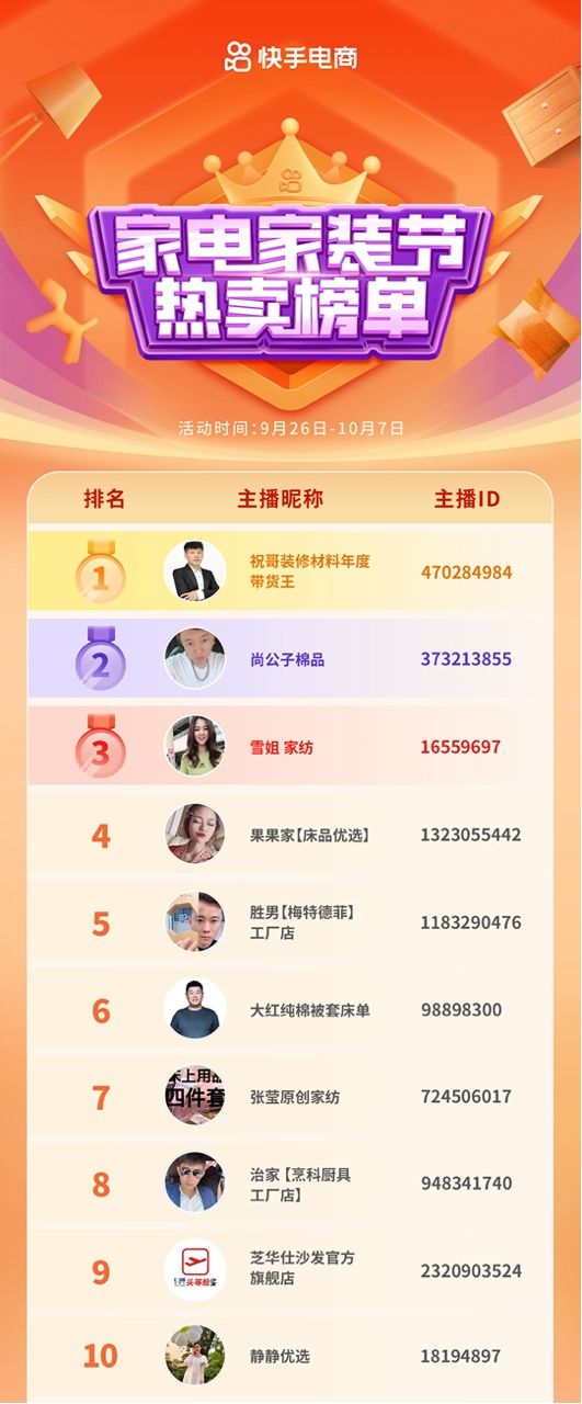 | ??10月12日消息,快手電商家電家裝節(jié)隨著國慶假期結(jié)束圓滿收官,此次家電家裝節(jié)共促成GMV超5.5億,同比去年增長了30%。參與活動的家具、家居、家紡、家電等垂直行業(yè)商家均取得了優(yōu)異的大促成績,家紡行業(yè)商家達成GMV超2.7億,家電行業(yè)商家達成GMV同比增長了75%。 ??其中,祝哥裝修材料、尚公子棉品、雪姐家紡、果果家、勝男【梅特德菲】工廠店登上了熱賣榜前五,品牌商家芝華仕也擠進了熱賣榜前十。