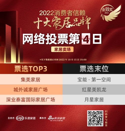 | 由樂居家居主辦,新浪家居承辦;CCTV《大國品牌》、家頁、家居質(zhì)量研究院、大國中居聯(lián)合主辦;全國工商聯(lián)家具裝飾業(yè)商會、中國建筑材料流通協(xié)會共同指導(dǎo);樂騰商學(xué)院、家頁智庫、家居質(zhì)量研究院提供研究支持。9月16日,第三屆《尋找優(yōu)質(zhì)消費者品牌--2022消費者信賴十大家居品牌》正式啟動。經(jīng)過企業(yè)申報、候選品牌公示環(huán)節(jié)后,于10月12日正式進入投票環(huán)節(jié)。>>點擊為家居賣場品牌投票 家居賣場第四日戰(zhàn)報如下
