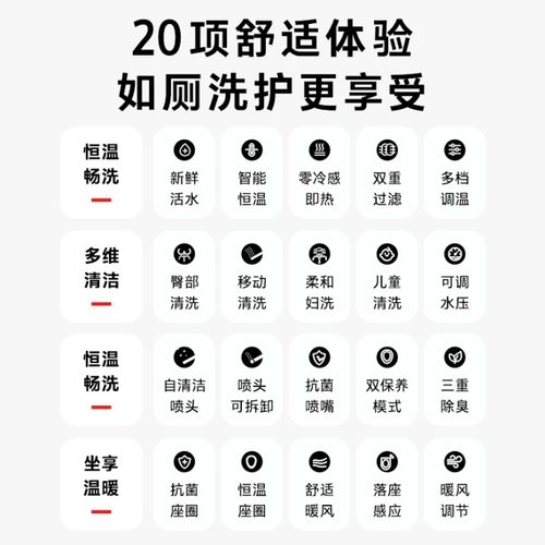 除了深度除臭需求,面對不同家庭成員的其他不同需求,“除臭卷王”配置了20多項完備的功能應(yīng)對,例如老年人如廁后擦拭難,擦拭不干凈引發(fā)的一系列健康問題,“除臭卷王”對應(yīng)擁有落座感應(yīng)、兩重過濾新鮮活水、自潔抗菌噴嘴等高科技功能,操作簡單易學(xué),比較人性化。