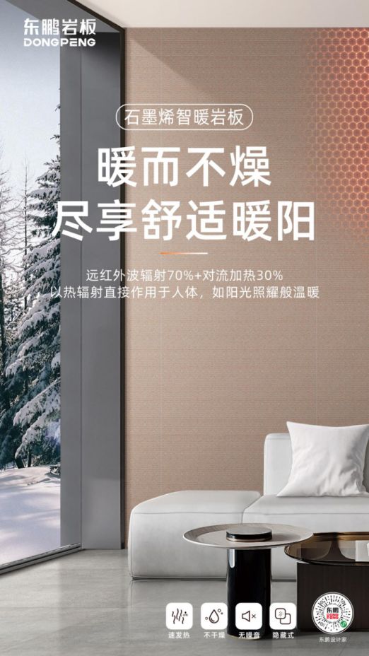 ??石墨烯智暖巖板還有強效抗菌、滅病毒、滅螨蟲的功效,通過釋放遠紅外線,持續(xù)運行對表面附著病毒的活性進行抑制,從而達到抑菌的效果,金黃色葡萄球菌、大腸桿菌5小時殺滅率99%以上,能夠帶來潔凈的效果。 ??石墨烯智暖巖板不僅可以應(yīng)用在家居空間中,還可廣泛應(yīng)用于醫(yī)療空間上,例如,醫(yī)院病房空間、月子中心、老人中心、理療中心等場所,其均勻散熱并不會帶來任何聲音,輔佐理療與抑菌的性能,能夠為病患帶來舒適、安靜的康養(yǎng)環(huán)境。 ??“可持續(xù)發(fā)展”已成為全球性議題,東鵬持續(xù)以創(chuàng)新技術(shù)與產(chǎn)品踐行低碳發(fā)展戰(zhàn)略,解碼綠色可持續(xù)發(fā)展路徑,始終秉承著“融合科技藝術(shù)、締造美好人居”的品牌發(fā)展理念、積極踐行低碳綠色發(fā)展戰(zhàn)略,推動行業(yè)高質(zhì)量發(fā)展。