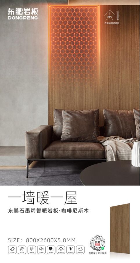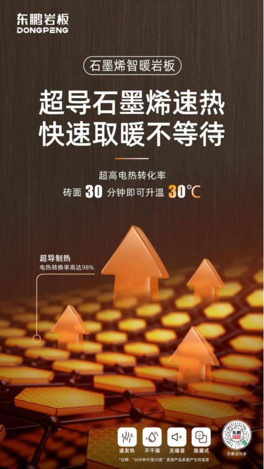 ??東鵬集團創(chuàng)新性地將石墨烯材料應(yīng)用于巖板中,融合設(shè)計、藝術(shù)與可持續(xù)發(fā)展的理念,打造出暖冬黑科技 - 石墨烯智暖巖板,用科技創(chuàng)新為千萬家庭提供溫暖保障。 ??石墨烯,是一種具備高導(dǎo)熱性、高導(dǎo)電性、超薄性能、高強度、高熱穩(wěn)定等特點的新材料,它被廣泛應(yīng)用在高科技領(lǐng)域,例如航空航天,新能源汽車等,被認為是一種未來革命性的材料。 ??東鵬集團研發(fā)出石墨烯3D大面積超導(dǎo)制熱技術(shù)并運用于智暖巖板中,將巖板、智能石墨烯發(fā)熱涂層、防水絕緣高密封裝三層保護設(shè)計,打造出集裝飾性和功能性為一體的產(chǎn)品。 ??石墨烯巖板的誕生,重新定義了新時代的取暖方式。它可以是建筑材料,應(yīng)用于眾多家庭場景中,如墻面、地暖、桌椅、操作臺面等,它也可以是家電,高效發(fā)熱、暖而不燥、環(huán)保節(jié)能,功能超越瓷磚,真正做到一墻暖一屋。 ??高效制熱,超低能耗 ??東鵬石墨烯智暖巖板采用石墨烯3D大面積超導(dǎo)熱技術(shù),以超強導(dǎo)熱性能的石墨烯作為發(fā)熱源,發(fā)熱快、效率高、制熱均勻,電熱轉(zhuǎn)換效率高達98%以上,導(dǎo)熱系數(shù)高達5300W/mk,產(chǎn)品開啟后表面迅速升溫,30分鐘磚面即可升溫30℃,即開即用,溫暖更省電,享受不一樣的舒心。
