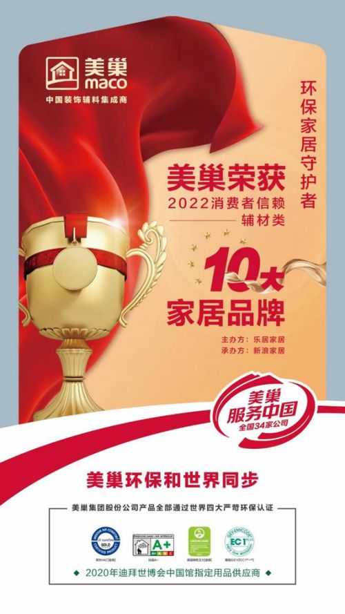 ??“2022消費者信賴十大家居品牌”評選活動由樂居家居主辦,新浪家居承辦,CCTV《大國品牌》、家頁、家居質(zhì)量研究院、大國中居聯(lián)合主辦。本次評選活動以“家居行業(yè)高質(zhì)量發(fā)展,扎實推進(jìn)優(yōu)質(zhì)品牌建設(shè)”為宗旨,通過對產(chǎn)品品質(zhì)、服務(wù)質(zhì)量、消費口碑、品牌影響力四大維度綜合評審。美巢憑借世界水平的環(huán)保產(chǎn)品、美巢服務(wù)中國的市場布局、良好的消費者口碑及深耕多年的品牌影響力榮登“2022消費者信賴十大家居品牌”輔材類榜單。 ??環(huán)保家居守護(hù)者,美巢環(huán)保和世界同步 ??作為消費者信賴十大家居品牌,美巢成立26年以來始終專注、專業(yè)于室內(nèi)環(huán)保裝飾輔料的研究、開發(fā)和制造。室內(nèi)裝飾與生命零距離,美巢有責(zé)任給消費者一個鄭重承諾——“美巢環(huán)保和世界同步”。美巢集團(tuán)股份公司產(chǎn)品全部通過了世界四大環(huán)保認(rèn)證:美國UL GREENGUARD綠色衛(wèi)士[金級]認(rèn)證、德國GEV EMICODE EC1PLUS認(rèn)證、歐洲歐陸IAC金級認(rèn)證、法國French A+級標(biāo)準(zhǔn)。憑借著世界水平的環(huán)保產(chǎn)品被授牌成為2020年迪拜世博會中國館指定用品供應(yīng)商。