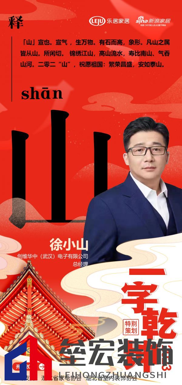 在新浪家居“2023一字乾坤”活動中,創(chuàng)維華中(武漢)電子有限公司總經(jīng)理徐小山:「山」宣也。宣氣,生萬物。有石而高,象形。凡山之屬皆從山。所閑切。 錦繡江山,高山流水,壽比南山、氣吞山河。二零二“山”,祝愿祖國:繁榮昌盛,安如泰山。 “以漢字賦能湖北家居企業(yè),彰顯厚積薄發(fā)之力”,以單字抒寫了各家企業(yè)及媒體的新年愿景與發(fā)展信條,領(lǐng)略楚風(fēng)漢韻下湖北家居人砥礪向前,揚帆未來的決心與動力,情暖兔歲,新啟華章。 |