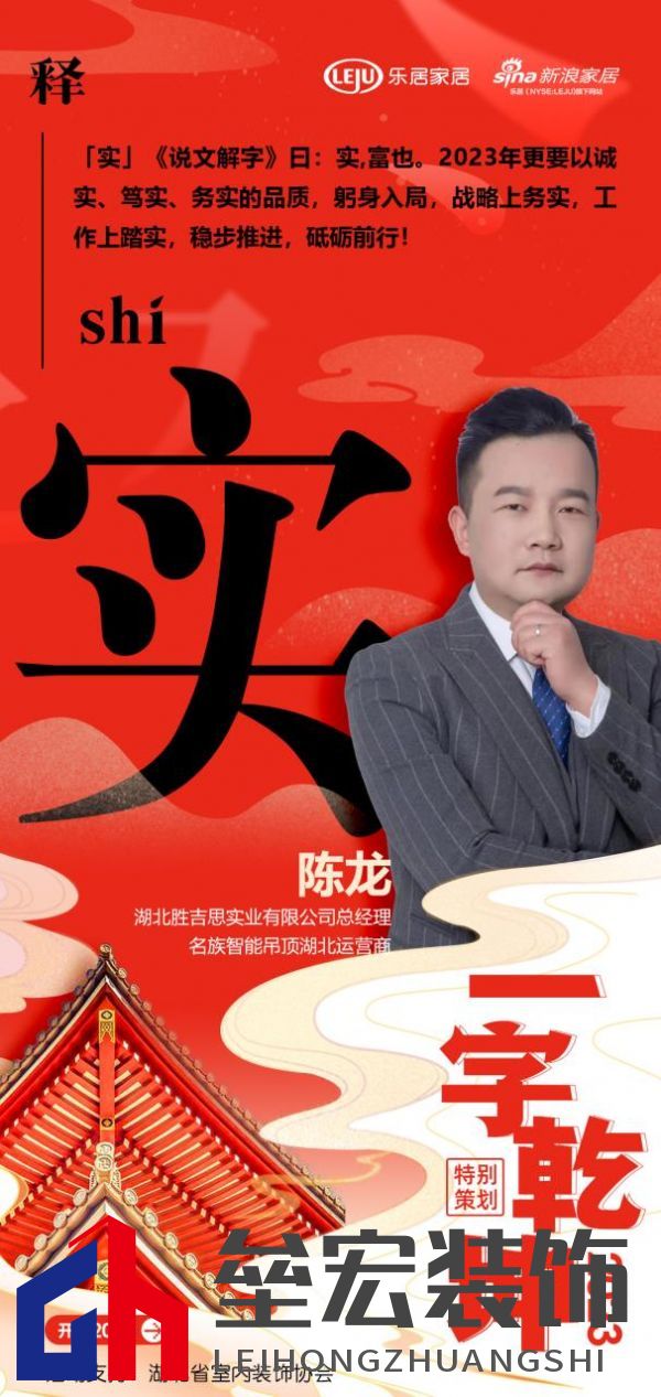 在新浪家居“2023一字乾坤”活動中,湖北勝吉思實業(yè)有限公司總經(jīng)理、名族智能吊頂湖北運營商陳龍:「實」《說文解字》曰:實,富也。2023年更要以誠實、篤實、務(wù)實的品質(zhì),躬身入局,戰(zhàn)略上務(wù)實,工作上踏實,穩(wěn)步推進,砥礪前行! “以漢字賦能湖北家居企業(yè),彰顯厚積薄發(fā)之力”,以單字抒寫了各家企業(yè)及媒體的新年愿景與發(fā)展信條,領(lǐng)略楚風(fēng)漢韻下湖北家居人砥礪向前,揚帆未來的決心與動力,情暖兔歲,新啟華章。 |