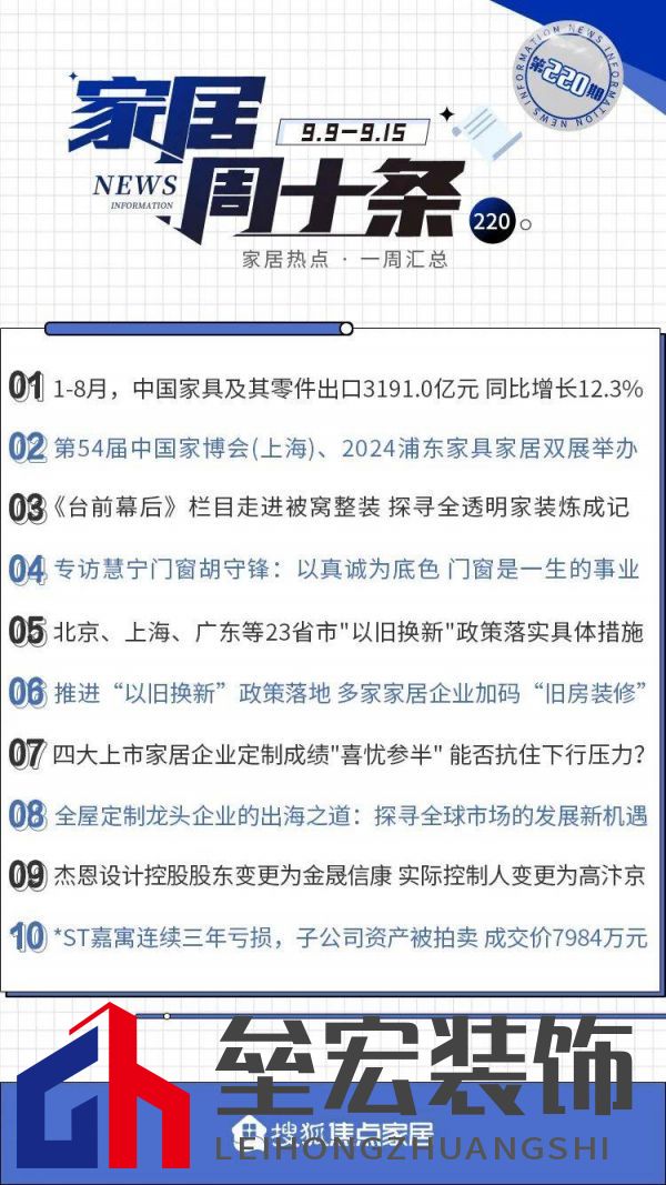 |  01 1-8月,中國家具 出口3191.0億元 同比增長12.3% 據(jù)海關(guān)總署9月10日發(fā)布的數(shù)據(jù),2024年8月,我國家具及其零件出口額為345.3億元,去年8月出口額為363.0億元,同比減少4.9%。 此外,1至8月,家具及其零件出口額為3,191.0億元,去年同期為2,841.8億元,同比增長12.3%;陶瓷產(chǎn)品出口額為1,021.2億元,去年同期為1,168.9億元,同比下降12.6%。 02 第54屆中國家博會(上海) 2024浦東家具家居雙展舉辦 9月11日,第54屆中國家博會(上海)于上海虹橋·國家會展中心盛大開幕。作為中國對外貿(mào)易中心集團(tuán)旗下品牌旗艦展會,中國家博會(上海)以“設(shè)計賦能,內(nèi)外雙驅(qū)”為主題,致力打造中國家居商業(yè)設(shè)計第一展。  本屆展覽規(guī)模達(dá)30萬平方米,匯聚顧家、悍高、泰普森、M&D、LAZBOY樂至寶、夢百合、絲漣、HC28|都匯里、幾間等超1300家參展企業(yè)。  9月13日15時,第二十九屆中國國際家具展覽會中國家具高端制造展FMC China 20242024摩登上海時尚家居展(簡稱“2024浦東家具家居雙展”)在上海新國際博覽中心和世博展覽館圓滿閉幕。  最新數(shù)據(jù)顯示:2024年浦東家具家居雙展參觀共計167,205 人次。其中海外28,644人次,在去年5天變成今年4天展期的情況下,仍實現(xiàn)了同比去年增長11.9%!新展商占比超過1/3達(dá)到1010家,10年以上參展商488家,共同推動行業(yè)革新與可持續(xù)發(fā)展。  03 臺前幕后|第二季 第2期 探尋“不怕踩雷的全透明家裝” 搜狐焦點家居攜手保利管道,帶來關(guān)于家裝的幕后故事,并聯(lián)手打造《臺前幕后》欄目,致敬家裝領(lǐng)域幕后英雄。本期臺前幕后就帶大家揭秘一家真正能做到“透明每一步”的整裝公司——被窩整裝。  被窩整裝注重裝修的透明與品質(zhì),更重視每一位業(yè)主的滿意度,“十心實意安信服務(wù)”,被窩兜底,說到做到!具體而言,報價透明,告別惡意增項;材料正品,從廠到家實時追蹤;施工透明,360°無死角監(jiān)控;匠心獨運(yùn),細(xì)節(jié)決定品質(zhì)。 04 慧寧門窗董事長胡守鋒: 真誠為人生底色,聚焦門窗成就一生事業(yè) 搜狐焦點家居特別策劃欄目《掌門人》 ,對話慧寧門窗董事長胡守鋒先生,聽他分享從零開始的創(chuàng)業(yè)歷程與企業(yè)未來愿景,并深度剖析行業(yè)發(fā)展趨勢與市場洞察,揭示慧寧門窗如何在激烈的市場競爭中憑借獨特的策略和穩(wěn)健的步伐脫穎而出。 胡守鋒表示:“未來能夠在行業(yè)中生存和發(fā)展的企業(yè)必定是誠信經(jīng)營、具有良心的企業(yè)。市場的淘汰賽已開始,企業(yè)必須穩(wěn)扎穩(wěn)打,不斷提升自身的綜合能力?!?/p>  自創(chuàng)立以來,慧寧門窗始終秉持“一厘米寬,一萬米深”的發(fā)展理念,以高標(biāo)準(zhǔn)要求自己,致力于為消費(fèi)者提供智能、節(jié)能、安全的高性能系統(tǒng)門窗產(chǎn)品。  展望未來,胡守鋒堅信,慧寧門窗將在行業(yè)責(zé)任感和持續(xù)創(chuàng)新的驅(qū)動下,繼續(xù)引領(lǐng)行業(yè)發(fā)展,邁向更加輝煌的明天。正是這種堅定的信念和持續(xù)的努力,慧寧門窗將在未來的發(fā)展中書寫新的輝煌篇章。 05 23省市“以舊換新”政策落實具體措施 涉智能馬桶、淋浴房、花灑... 今年三月,國務(wù)院發(fā)布了《推動大規(guī)模設(shè)備更新和消費(fèi)品以舊換新行動方案》以來,“以舊換新”政策收到廣大行業(yè)人士的關(guān)注,聚焦在相關(guān)補(bǔ)貼政策如何落地。目前,隨著“以舊換新”政策的逐步落實,全國23個包括北京、上海、廣東、福建、湖南、等省市陸續(xù)出臺相關(guān)落地政策。  8月26日 ,北京發(fā)布《積極推進(jìn)家裝以舊換新工作方案》。9月2日,上海市商務(wù)委等六部門關(guān)于印發(fā)《上海市加力支持綠色智能家電家居消費(fèi)補(bǔ)貼政策》的通知 。此外,廣東聚焦綠色、智能、適老,對消費(fèi)者購買舊房裝修和廚衛(wèi)等局部改造、居家適老化改造所用物品和材料給予補(bǔ)貼,促進(jìn)智能家居消費(fèi)。 06 推進(jìn)“以舊換新”政策落地 多家企業(yè)加碼“舊房裝修” 近日,上海印發(fā)《消費(fèi)品以舊換新工作實施方案》,其中提到,對家居消費(fèi)按照銷售價格的15%予以補(bǔ)貼。值得注意的是,此次上海市重點提到了針對“舊房裝修改造”開展專屬補(bǔ)貼。  業(yè)內(nèi)人士表示,家裝以舊換新對存量房產(chǎn)的發(fā)展有著重大的推動作用,同時家裝本身就是一個“大家居”概念的產(chǎn)業(yè)鏈,鏈條非常長,也將帶動多產(chǎn)業(yè)鏈發(fā)展。 07 四大上市企業(yè)定制成績喜憂參半 能否抗住下行壓力? 受上游房地產(chǎn)行業(yè)的快速調(diào)整影響,消費(fèi)信心也尚待進(jìn)一步恢復(fù),包括全屋定制在內(nèi)的家居行業(yè)短期壓力加大。顧家家居、兔寶寶、大亞圣象、華帝股份四大上市公司,近年均在跨界定制業(yè)務(wù)。以2024上半年的營收指標(biāo)看,顧家、圣象同比實現(xiàn)增長,兔寶寶和華帝業(yè)績下滑。 隨著家居消費(fèi)趨勢的變化,企業(yè)間的競爭由單品轉(zhuǎn)向全屋,日趨白熱化的態(tài)勢有增無減。業(yè)內(nèi)人士分析 提升客單值把流量價值最大化是未來的發(fā)力點,而裝企渠道、海外市場、差異化產(chǎn)品以及電商模式等成為新的增長突破口。 08 全屋定制龍頭企