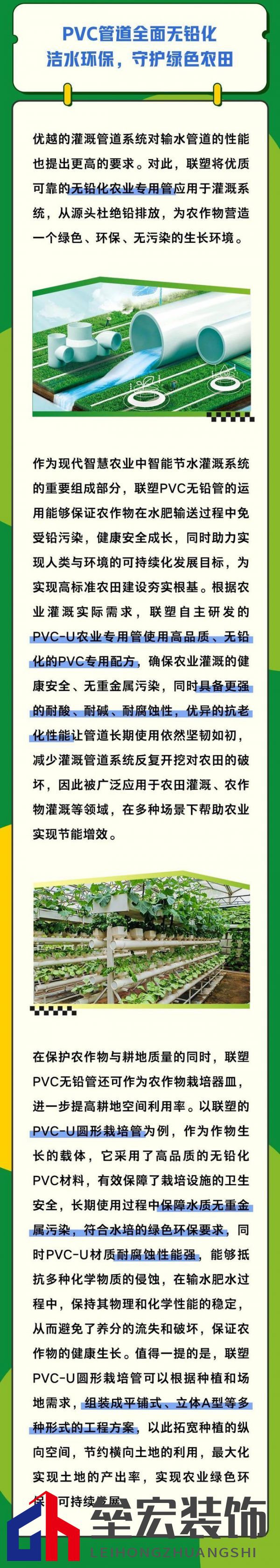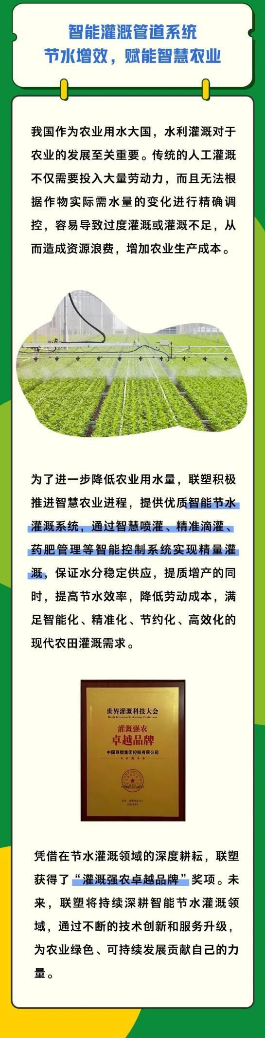 憑借在節(jié)水灌溉領(lǐng)域的深度耕耘,聯(lián)塑獲得了“灌溉強(qiáng)農(nóng)卓越品牌”獎(jiǎng)項(xiàng)。未來,聯(lián)塑將持續(xù)深耕智能節(jié)水灌溉領(lǐng)域,通過不斷的技術(shù)創(chuàng)新和服務(wù)升級(jí)為農(nóng)業(yè)綠色、可持續(xù)發(fā)展貢獻(xiàn)自己的力量。 潔水環(huán)保,守護(hù)綠色農(nóng)田 優(yōu)越的灌溉管道系統(tǒng)對(duì)輸水管道的性能也提出更高的要求。對(duì)此,聯(lián)塑將優(yōu)質(zhì)可靠的無鉛化農(nóng)業(yè)專用管應(yīng)用于灌溉系統(tǒng),從源頭杜絕鉛排放,為農(nóng)作物營造一個(gè)綠色、環(huán)保、無污染的生長環(huán)境。 作為現(xiàn)代智慧農(nóng)業(yè)中智能節(jié)水灌溉系統(tǒng)的重要組成部分,聯(lián)塑PVC無鉛管的運(yùn)用能夠保證農(nóng)作物在水肥輸送過程中免受鉛污染,健康安全成長,同時(shí)助力實(shí)現(xiàn)人類與環(huán)境的可持續(xù)化發(fā)展目標(biāo),為實(shí)現(xiàn)高標(biāo)準(zhǔn)農(nóng)田建設(shè)夯實(shí)根基。根據(jù)農(nóng)業(yè)灌溉實(shí)際需求,聯(lián)塑自主研發(fā)的PVC-U農(nóng)業(yè)專用管使用高品質(zhì)、無鉛化的PVC專用配方,確保農(nóng)業(yè)灌溉的健康安全、無重金屬污染,同時(shí)具備更強(qiáng)的耐酸、耐堿、耐腐蝕性,優(yōu)異的抗老化性能讓管道長期使用依然堅(jiān)韌如初減少灌溉管道系統(tǒng)反復(fù)開挖對(duì)農(nóng)田的破壞,因此被廣泛應(yīng)用于農(nóng)田灌溉、農(nóng)作物灌溉等領(lǐng)域,在多種場(chǎng)景下幫助農(nóng)業(yè)實(shí)現(xiàn)節(jié)能增效。