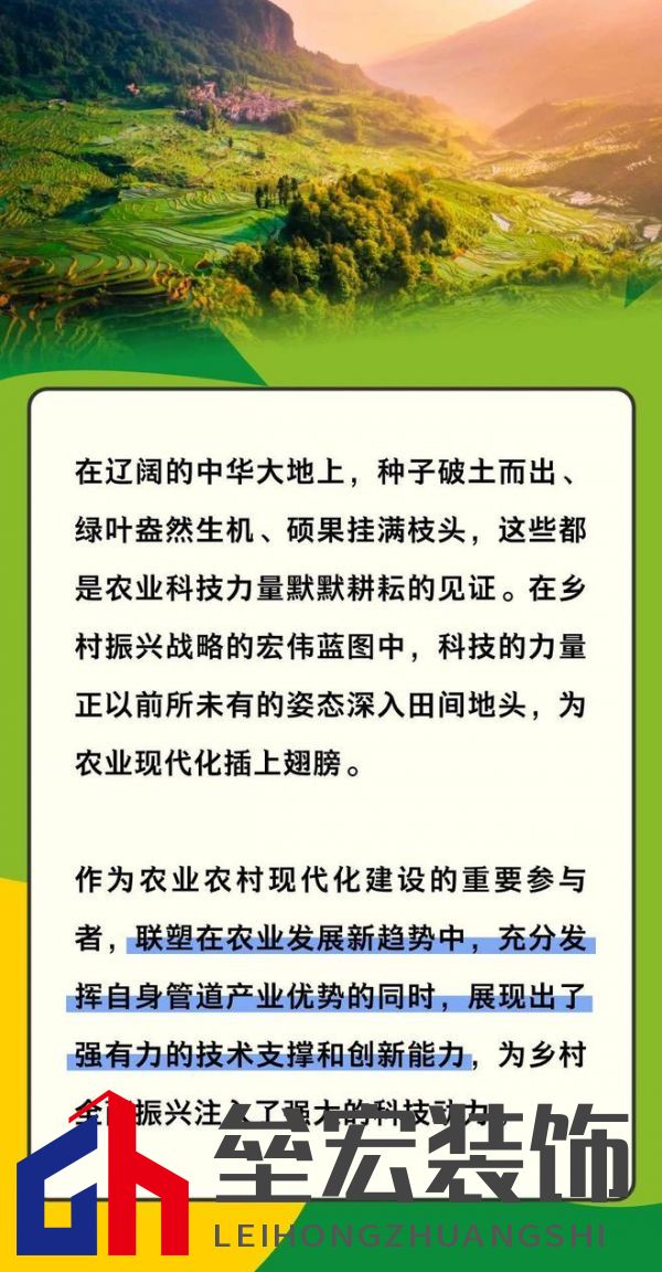 | 在遼闊的中華大地上,種子破土而出、綠葉盎然生機(jī)、碩果掛滿枝頭,這些都是農(nóng)業(yè)科技力量默默耕耘的見證。在鄉(xiāng)村振興戰(zhàn)略的宏偉藍(lán)圖中,科技的力量正以前所未有的姿態(tài)深入田間地頭,為農(nóng)業(yè)現(xiàn)代化插上翅膀。 作為農(nóng)業(yè)農(nóng)村現(xiàn)代化建設(shè)的重要參與者,聯(lián)塑在農(nóng)業(yè)發(fā)展新趨勢(shì)中,充分發(fā)揮自身管道產(chǎn)業(yè)優(yōu)勢(shì)的同時(shí),展現(xiàn)出了強(qiáng)有力的技術(shù)支撐和創(chuàng)新能力,為鄉(xiāng)村全面振興注入了強(qiáng)大的科技動(dòng)力。