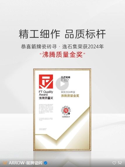 ??本年度測評中,近500款產(chǎn)品競相角逐。箭牌瓷磚參評的尋·逸石集以卓越性能與優(yōu)異品質(zhì)脫穎而出,榮獲2024年度“沸騰質(zhì)量金獎”,在行業(yè)內(nèi)引發(fā)廣泛關(guān)注。