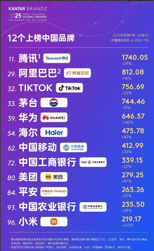 | ??5月15日,2025年凱度BrandZ最具價值全球品牌100強榜單正式揭曉,品牌總價值達到10.7萬億美元,同比增長29%,彰顯全球頂端品牌的韌性。蘋果作為榜單中唯一的萬億美元級品牌,連續(xù)四年蟬聯(lián)榜首,騰訊、華為、海爾等12個中國品牌躋身百強陣營。其中,海爾連續(xù)7年蟬聯(lián)全球唯一物聯(lián)網(wǎng)生態(tài)品牌,全球排名從最初的第89名逐步上升至第54名,品牌價值同比增長47%,再創(chuàng)新高。
