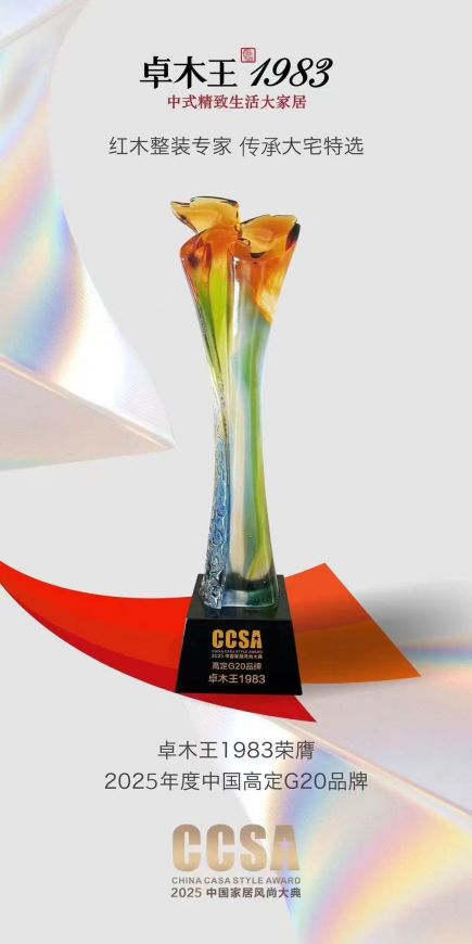 2025年7月8日,在萬眾矚目的“萬福倉之夜——致敬高定十年·第十屆CCSA家居風(fēng)尚大典暨2025高定十年G20+頒獎禮”上,紅木整裝創(chuàng)lin品牌卓木王再度榮膺“高定G20品牌大獎”。 作為“紅木整裝世家 傳承祖宅首選”品牌,卓木王已連續(xù)幾年蟬聯(lián)此項行業(yè)頂ji榮譽(yù),卓木王持續(xù)獲得行業(yè)高度認(rèn)可,穩(wěn)居中式高定標(biāo)桿地位。
