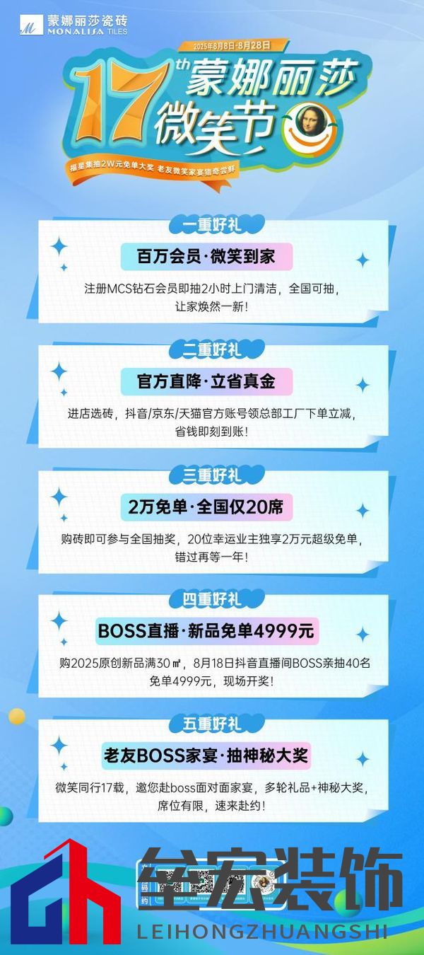 ??為真誠回饋廣大用戶的信賴,今年針對2025原創(chuàng)新品——「時(shí)空石韻」與「無極石界」的優(yōu)惠力度進(jìn)行了重磅升級(jí),凡用戶購買上述新品對應(yīng)規(guī)格瓷磚面積達(dá)30㎡及以上,即可有機(jī)會(huì)抽取4999元免單大獎(jiǎng),鎖定8月18日,蒙娜麗莎瓷磚抖音官方直播間將迎來神秘BOSS空降,這場專屬直播將會(huì)揭曉免單名額! 微笑力量,從品質(zhì)交付到情感聯(lián)結(jié)??承載著對”美好家“與健康生活的執(zhí)著追求,更為了回饋萬千用戶的信任與期待,蒙娜麗莎微笑節(jié)已在全國范圍200多個(gè)城市,超3000家線下門店展開,同步打通天貓、京東、抖音直播間等線上渠道,形成了全覆蓋渠道的系列主題活動(dòng)。 ??今年8月8日,這場持續(xù)的溫暖承諾將再度兌現(xiàn)。第十七屆蒙娜麗莎微笑節(jié)即將盛大啟幕,其中,最令人期待的”BOSS微笑家宴“,是品牌誠意與溫度的集中體現(xiàn),用戶將獲得與老板面對面交流的機(jī)會(huì),暢談使用蒙娜麗莎瓷磚的真實(shí)體驗(yàn)與生活故事。?現(xiàn)場還將精心準(zhǔn)備多輪禮品福利,更有機(jī)會(huì)抽取驚喜大獎(jiǎng),這不僅是一場傾聽用戶心聲的對話,更是一次拉近品牌與用戶距離的情感交融。