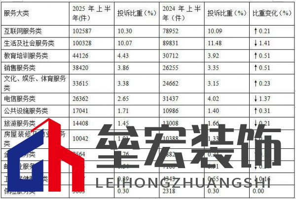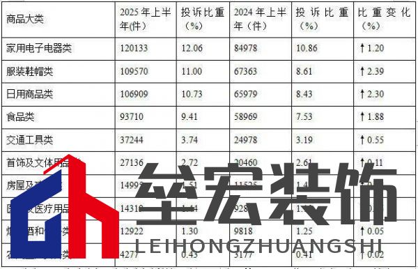 | 8月6日,中國消費者協(xié)會發(fā)布“2025年上半年全國消協(xié)組織受理投訴分類基本情況”。 商品大類投訴數據 根據各商品大類投訴數據,家用電子電器類、房屋及建材類投訴量均進入所屬投訴類別的前十位。其中,家用電子電器類投訴量居首位,達120133件,投訴比重為12.06%,與2024年同期相比投訴比重上升1.2%。房屋及建材類投訴量居第七位,為14995件,投訴比重為1.51%,與2024年同期相比上升0.04%。 服務大類投訴數據 根據2025年上半年服務大類投訴數據,房屋裝修及物業(yè)服務投訴量居第九位,為10042件,投訴比重為1.01%,與2024年上半年相比投訴比下降0.32%。 具體商品投訴 在具體商品投訴中,家具投訴量為19760件,與2024年同期相比上升36.79%。 |