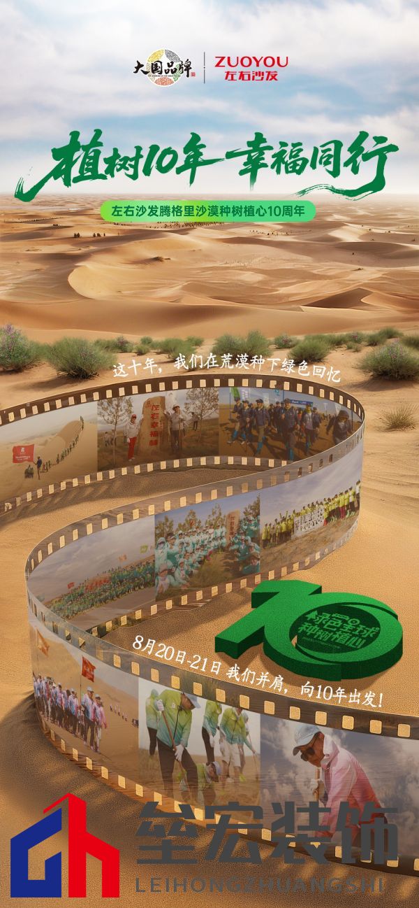 | ??8月20-21日,一場(chǎng)跨越十年的綠色之約今日正式啟程 —— 左右沙發(fā)騰格里沙漠種樹(shù)植心10周年,正帶著“植樹(shù)10年 幸福同行”的溫暖主題,向每一位熱愛(ài)自然、心懷公益的人發(fā)出誠(chéng)摯邀請(qǐng)。這不僅是一次公益行動(dòng)的延續(xù),更是對(duì)十年堅(jiān)守的深情回望,對(duì)綠色未來(lái)的鄭重承諾。從2016年到2025年,左右沙發(fā)秉持公益初心踐行綠色使命,用“長(zhǎng)期主義”詮釋大國(guó)品牌責(zé)任擔(dān)當(dāng),讓每一棵扎根沙漠的樹(shù)苗,都成為希望的見(jiàn)證,成功鑄就家具行業(yè)的綠色標(biāo)桿。